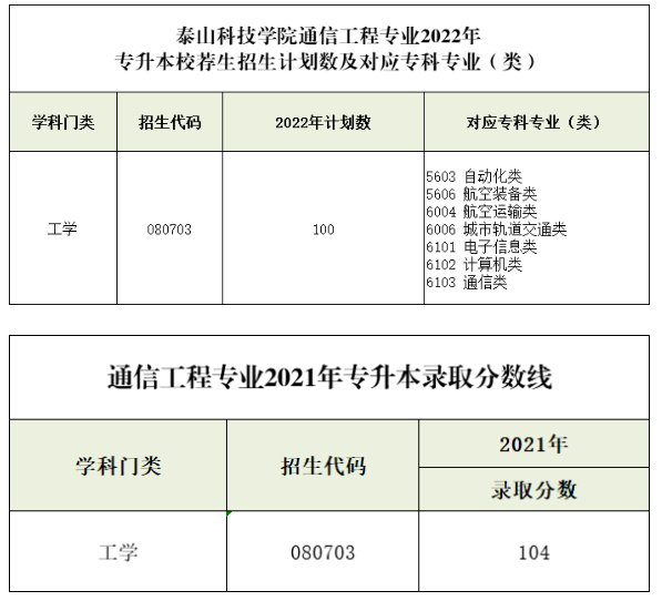 泰山科技学院专升本通信工程招收专科专业及分数线